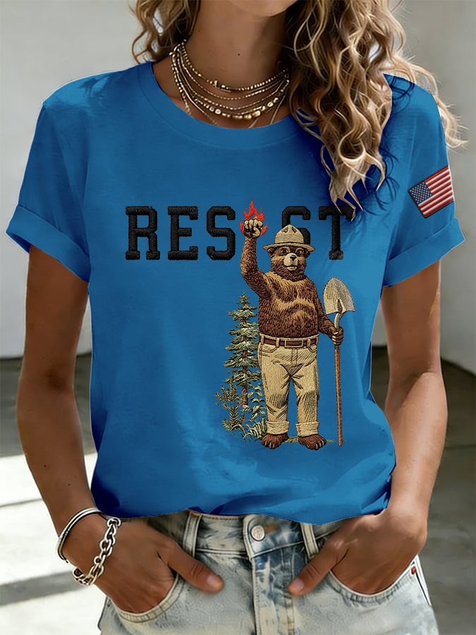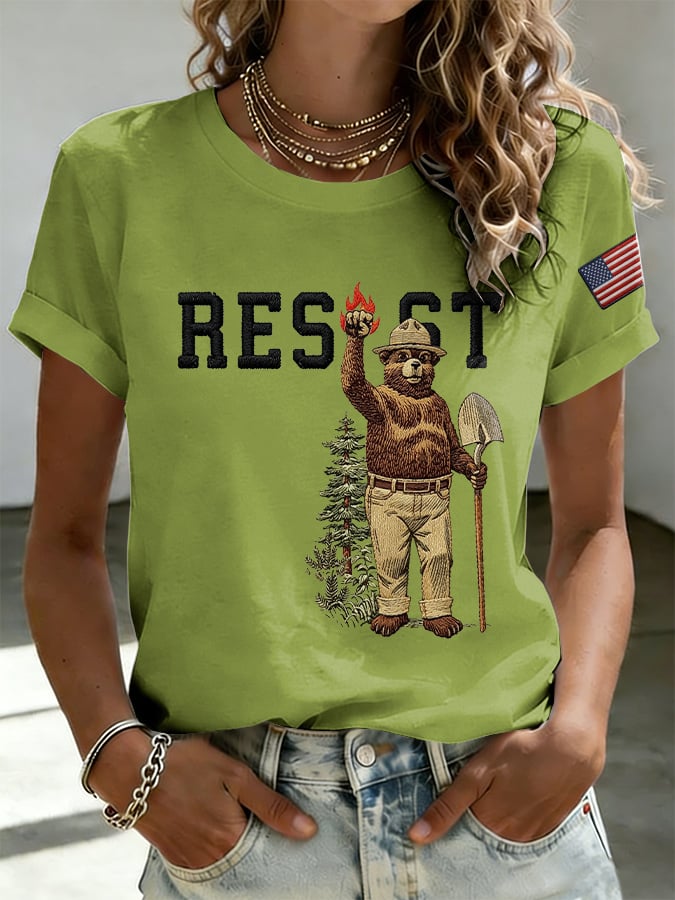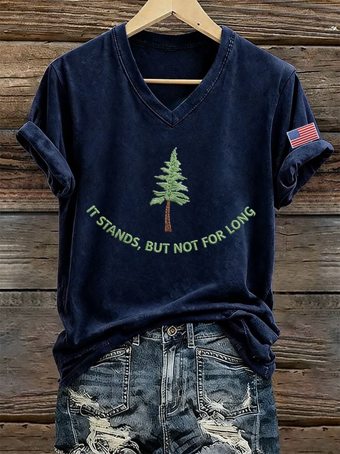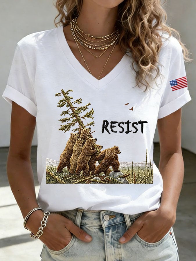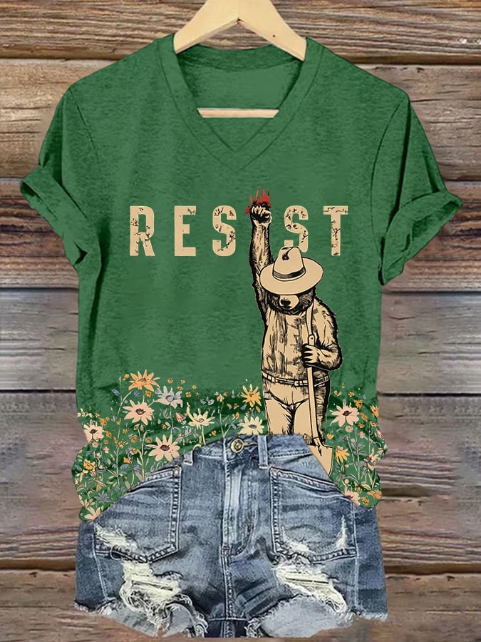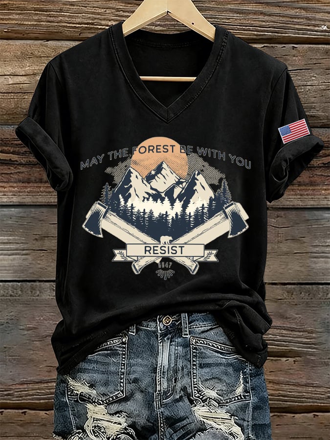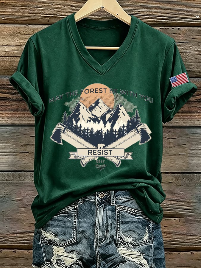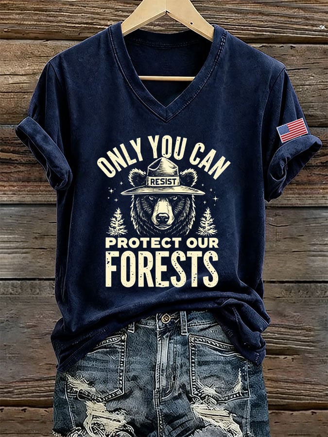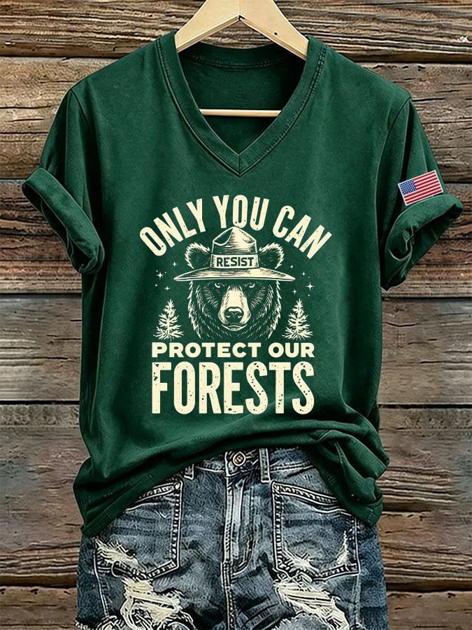 Women's Retro Resist Save The Forest Service Print V-Neck T-Shirt