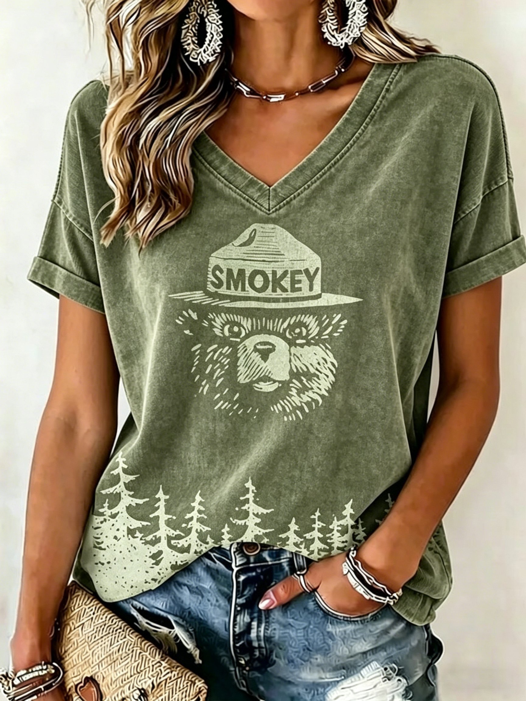 V-Neck Retro Save The Forest Service Print T-Shirt